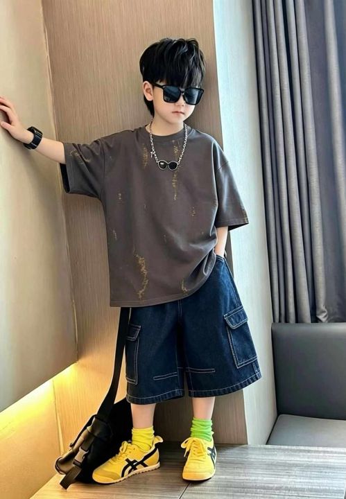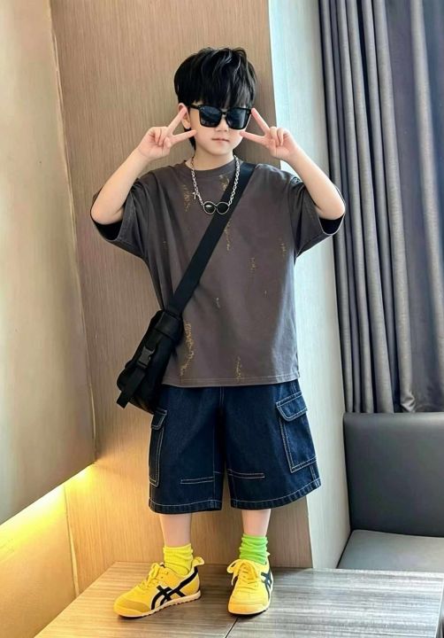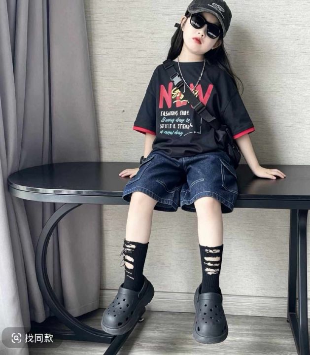 夏季新款男女童童装网红复古洗水棉多袋工装牛仔短裤,...