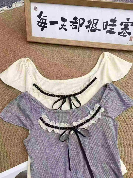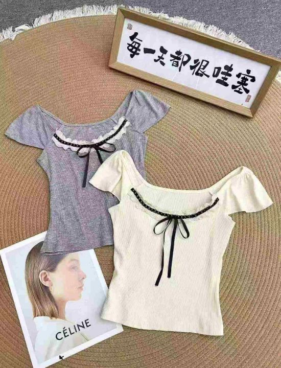 法式蕾丝拼接短袖459件6.5,面料柔软有弹力,蝴蝶结蕾...