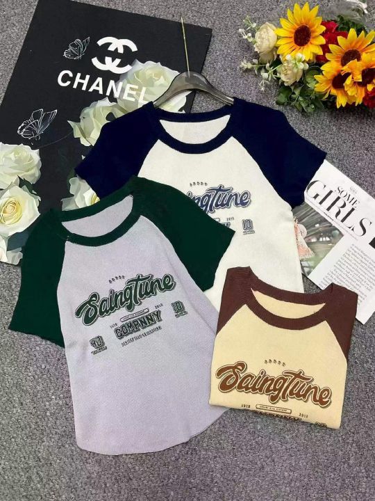 夏季新款美式撞色插肩复古印花针织短袖T桖,独立包装...
