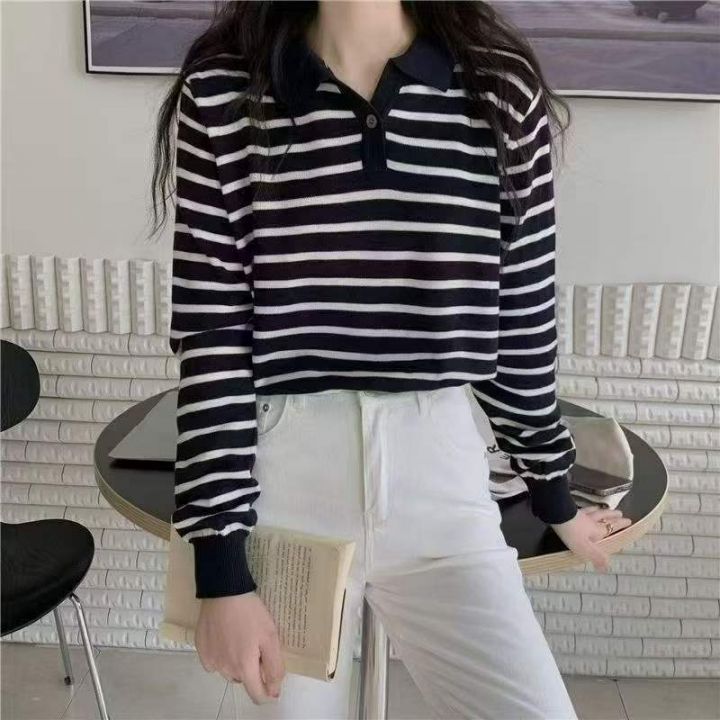 早秋新款韩系宽松高级感撞色条纹百搭POLO领长袖针织毛...
