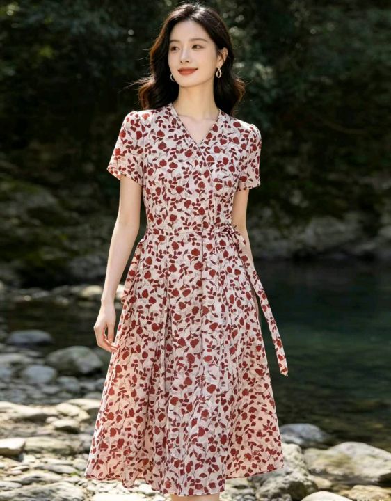 复古碎花连衣裙,一片式围裹剪裁+同色系腰带新款入库1...