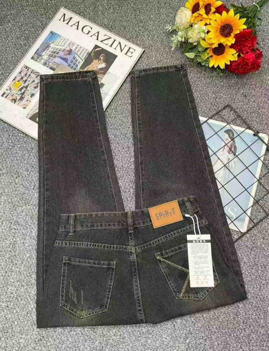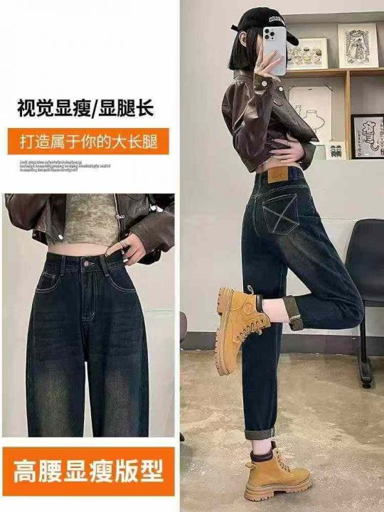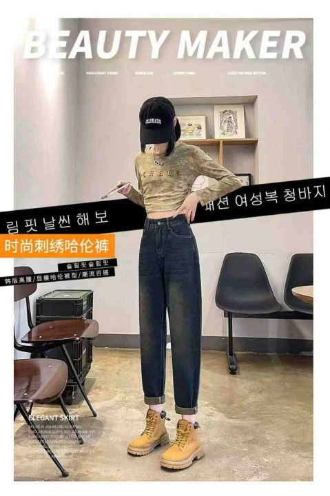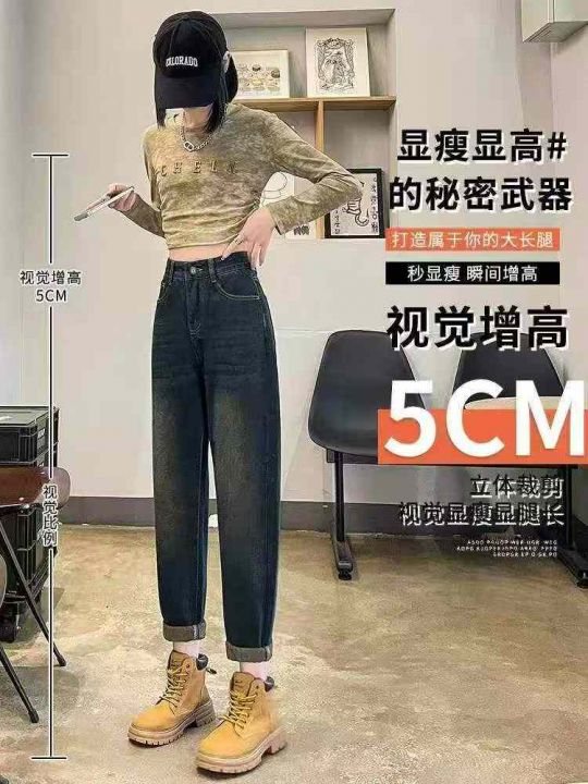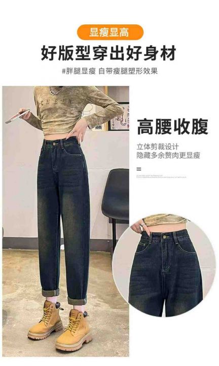 春夏季新款网红复古半松紧腰微胖MM哈伦牛仔老爹裤,独...