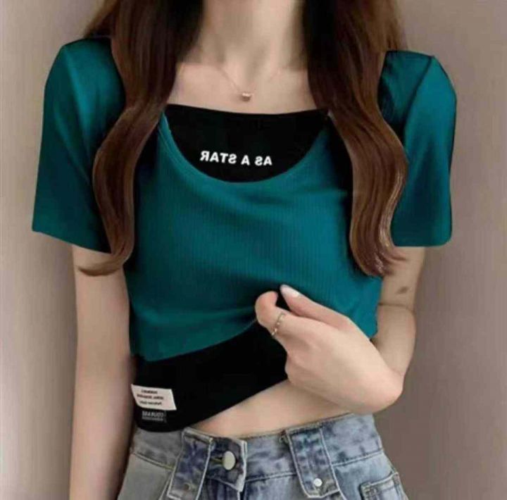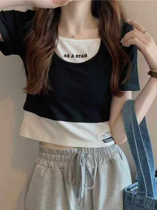 4.8清184件设计感小众假两件高腰露脐修身显瘦短袖T恤...