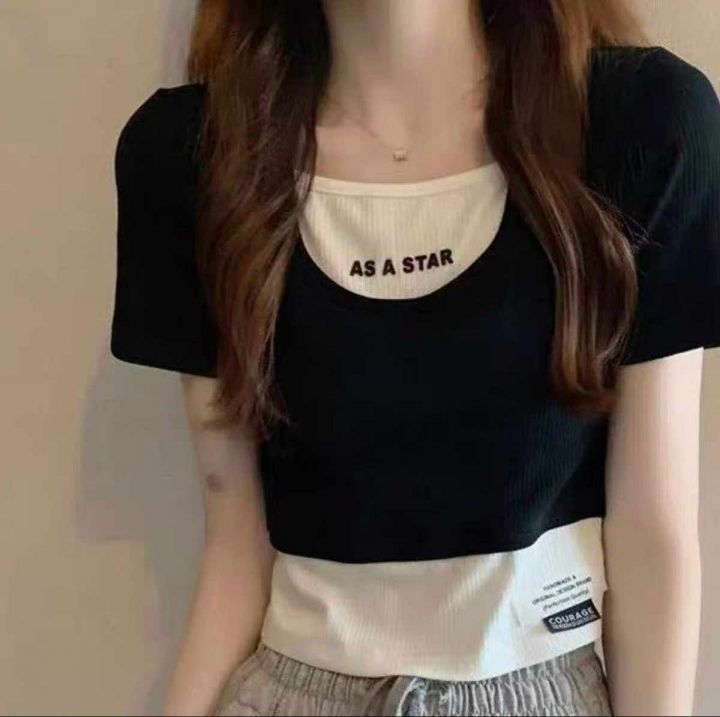 184件设计感小众假两件高腰露脐修身显瘦短袖T恤,码数M-L码。优质螺纹面料有弹力,黑白色为主。独立包装,分货➕0.5