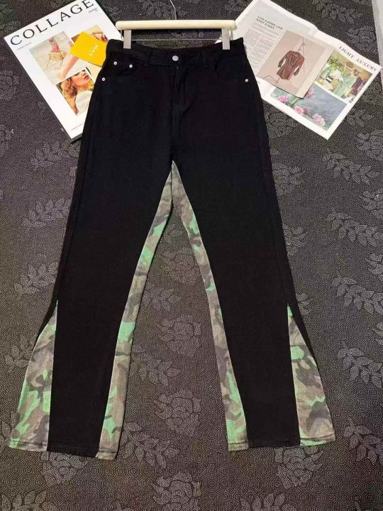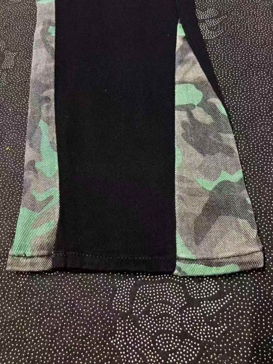 男女同款迷彩拼接微喇叭牛仔裤 433件,全清11.8元,分货12.8元,正品独立包装,货品干净,码数:S到3XL,潮牌男女同款迷彩拼接牛仔裤直筒复古长裤。