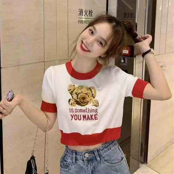 481件小熊刺绣针织网红短袖,红白撞色,均码110斤左右...