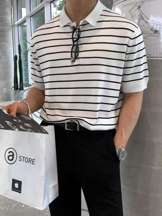 全清价6.9元日系气质条纹短袖男款Polo衫夏季透气宽松棉翻领T恤衫,独立包装...