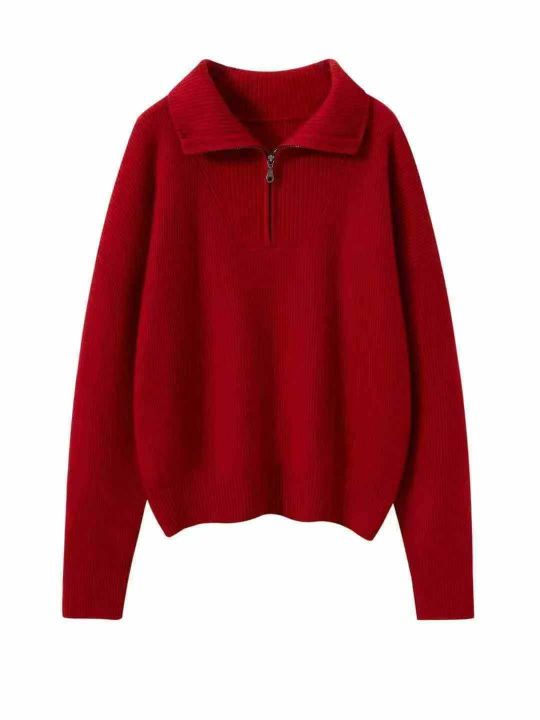 全清13.8,欧洲站高端大牌新年红色半拉链翻领毛衣女秋冬慵懒宽松套头针织衫...