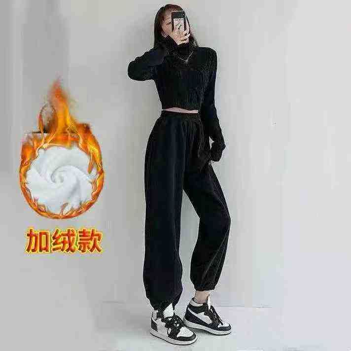高品质卫裤加绒女秋冬加绒高腰显瘦宽松抽绳束脚灰色运动百搭,整款2色,s-5...