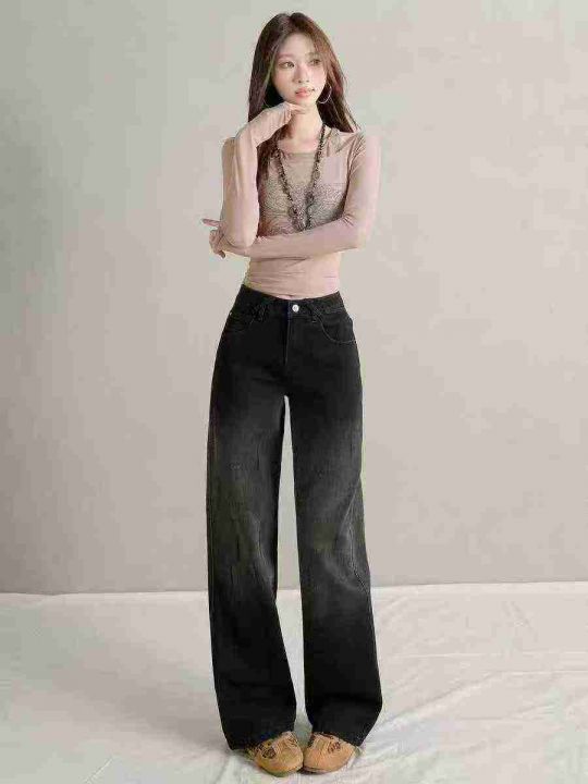 2025新款女士秋季高腰显瘦渐变黑灰色阔腿直筒牛仔裤360条,码数S-2XL,独立...