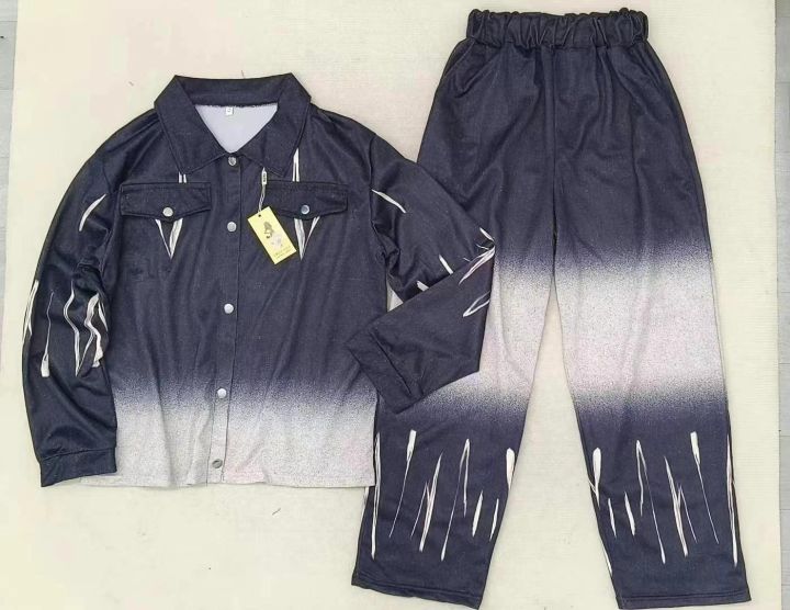 006款,网红外套仿牛仔渐变色休闲两件套套装,面料弹力透气,柔软舒适,版型宽松够大,松紧裤腰,400套,1一3码,独立包装吊牌,全清8.8元,分货+0.5
