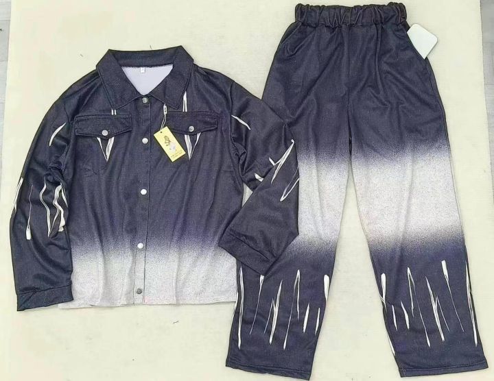 006款,网红外套仿牛仔渐变色休闲两件套套装,面料弹力透气,柔软舒适,版型宽松够大,松紧裤腰,400套,1一3码,独立包装吊牌,全清8.8元,分货+0.5