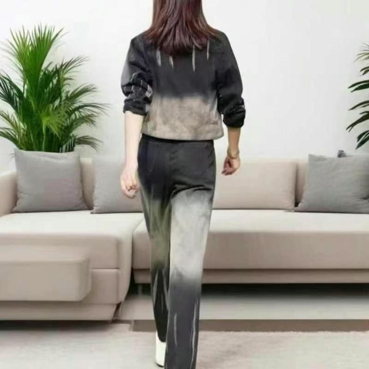 006款,网红外套仿牛仔渐变色休闲两件套套装,面料弹...