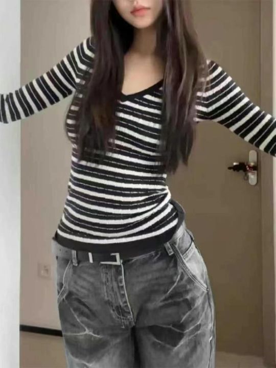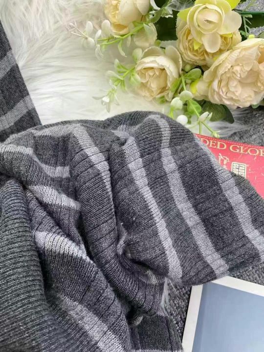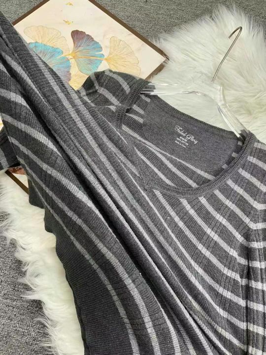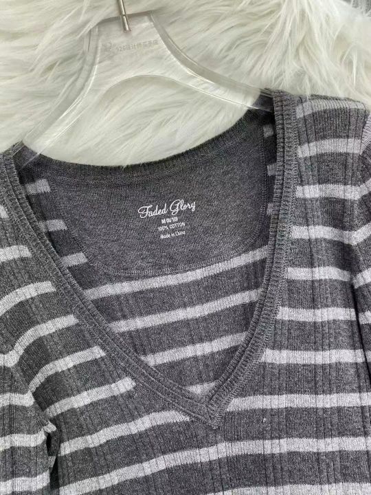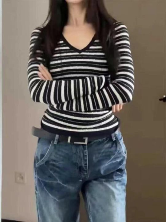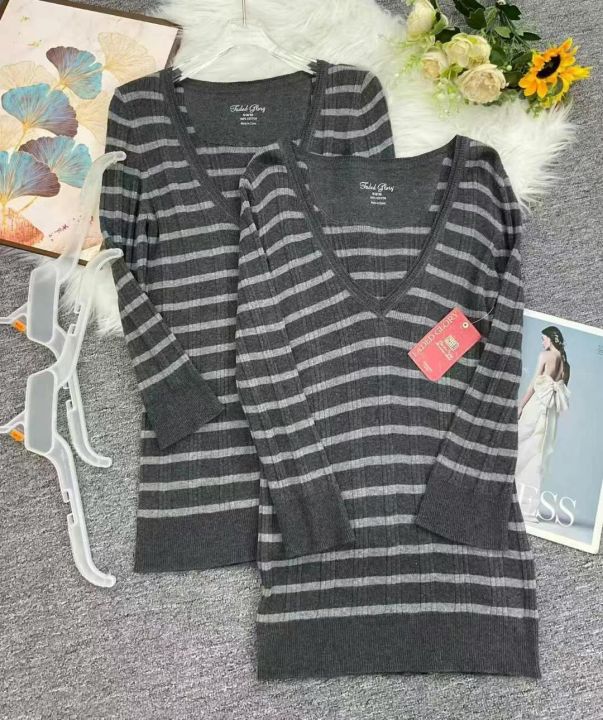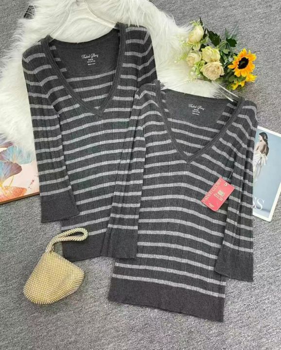 品牌原单女装高弹力条纹针织大V领套头毛衣,2件1包装...