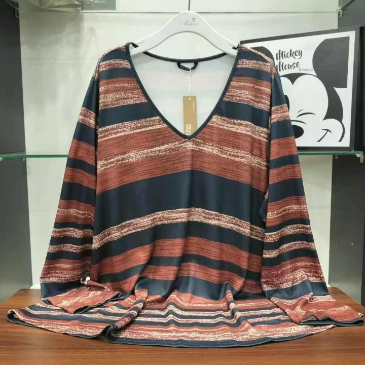 3.88元秒杀[爱心][爱心] 春秋超大码高弹力女深V领长袖条纹欧美款T恤,独立包装吊牌,码数45-58,数量106件。。。
