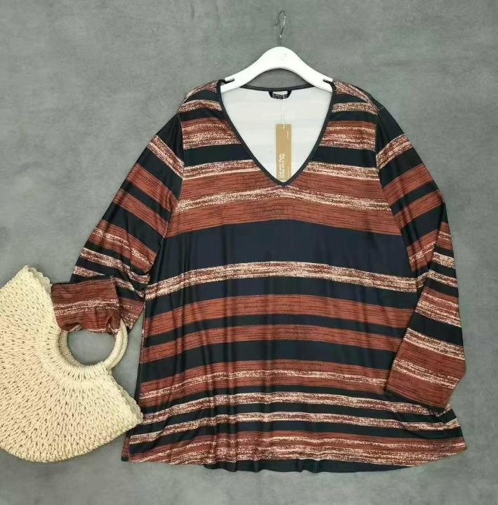 3.88元秒杀[爱心][爱心] 春秋超大码高弹力女深V领长袖条纹欧美款T恤,独立包装吊牌,码数45-58,数量106件。。。