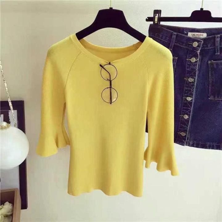 冰丝打底衫 女2025新款修身薄款荷叶边七分短袖 喇叭袖针织上衣。数量215条,独立包装,单款多色,高弹力面料,均码,全清6.5
