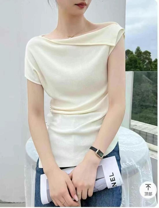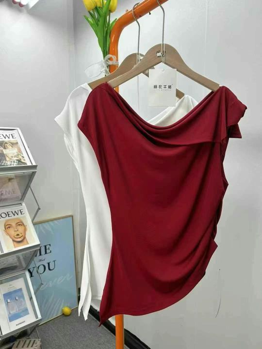 性感辣妹一字肩短袖t恤女2025夏季设计感不规则修身显瘦褶皱上衣,670件,面料:冰丝螺纹,有质感,货品干净,独立包装,M-2XL,分货加1