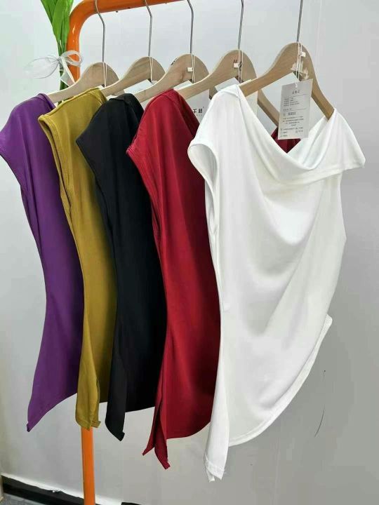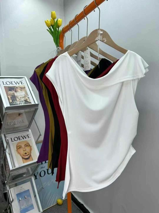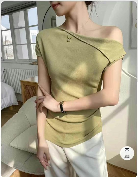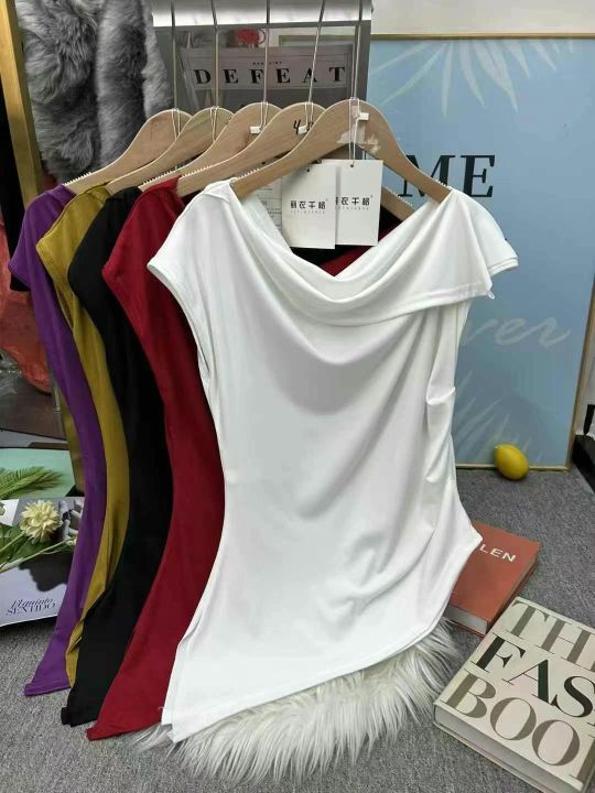 性感辣妹一字肩短袖t恤女2025夏季设计感不规则修身显瘦褶皱上衣,670件,面料:冰丝螺纹,有质感,货品干净,独立包装,M-2XL,分货加1