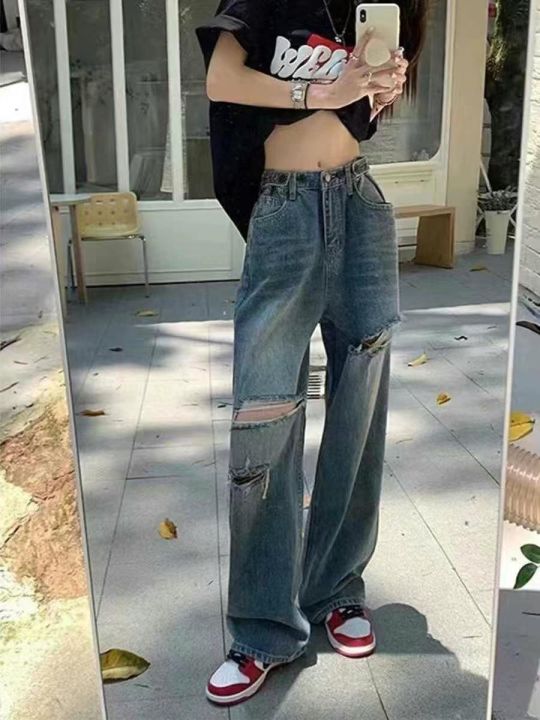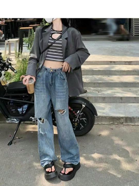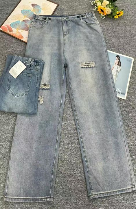 春夏新款大码胖妹妹女装牛仔破洞阔腿裤,独立包装带吊...