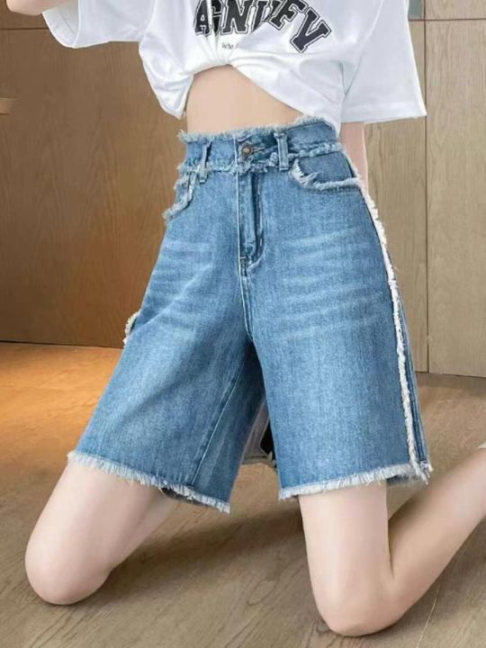 夏季新款女装高腰显瘦a字版梨型身材宽松直筒阔腿毛边5...