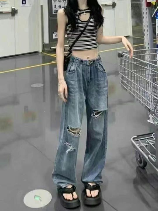 春夏新款大码胖妹妹女装牛仔破洞阔腿裤,独立包装带吊...
