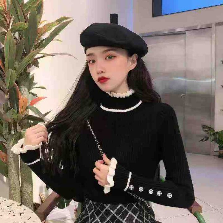 秋冬新款复古气质木耳边弹力修身显瘦套头毛衣,独立包装,均码面料软糯舒适...