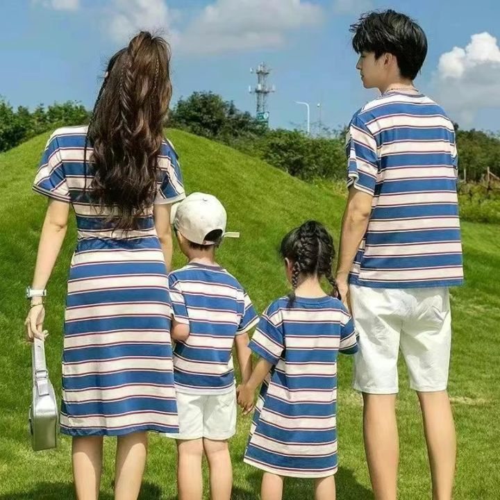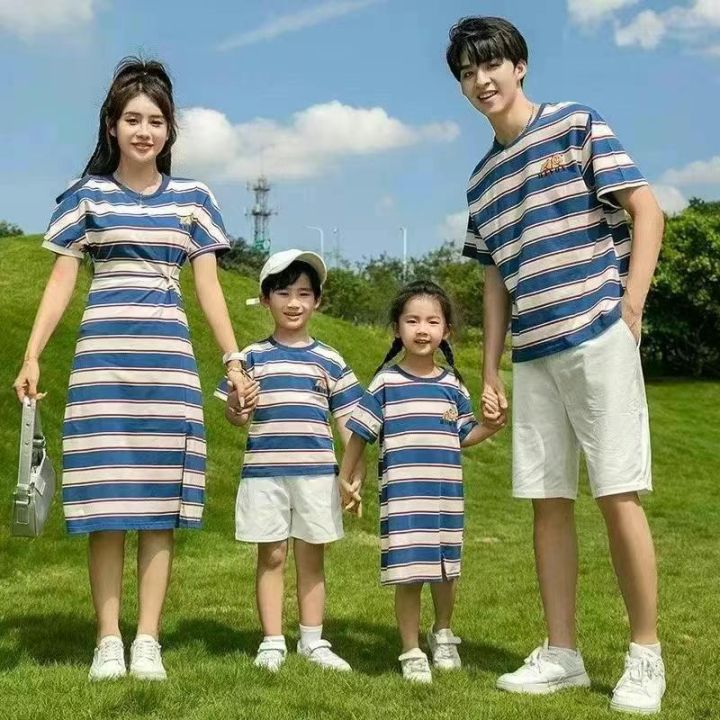 亲子装新款一家三口四口海边度假母女装条纹连衣裙260...