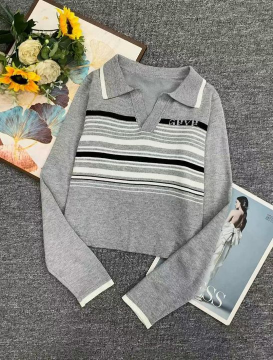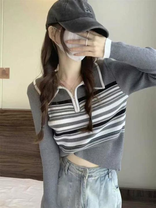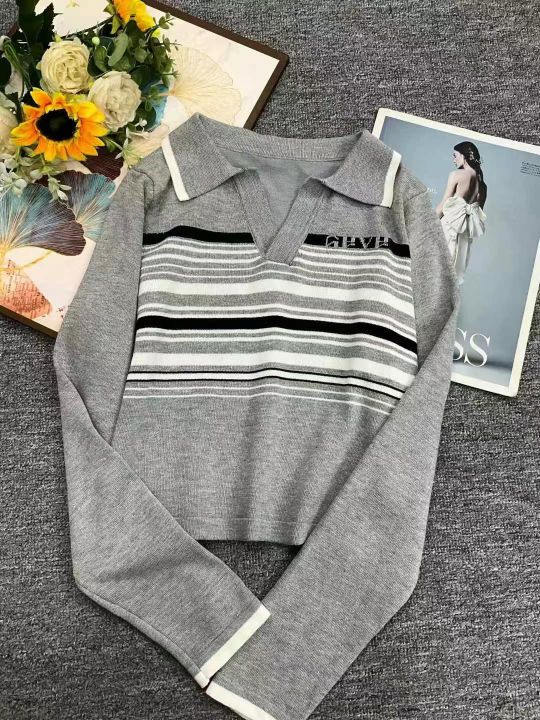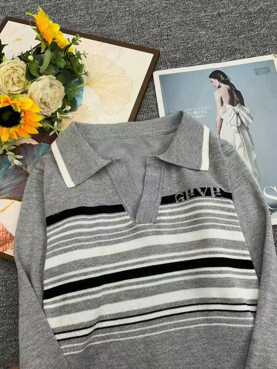 春秋新款复古polo翻领针织撞色条纹字母长袖套头毛衣,...