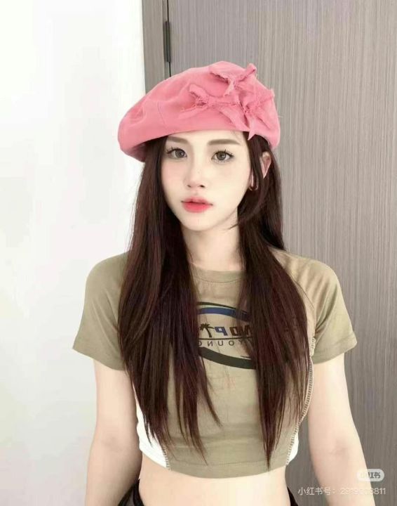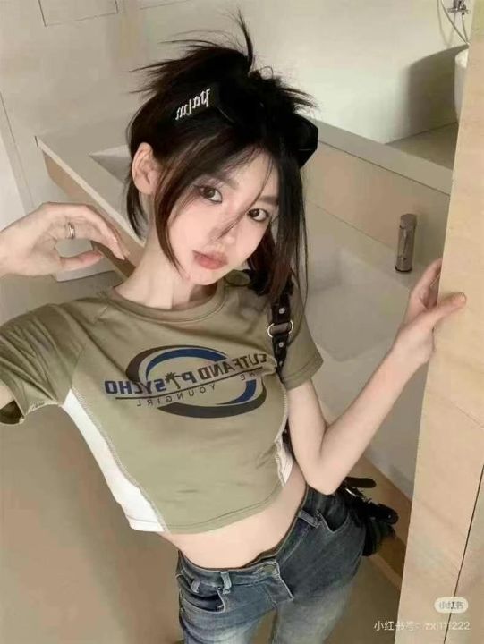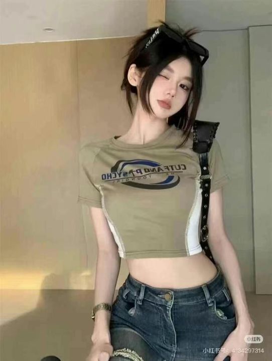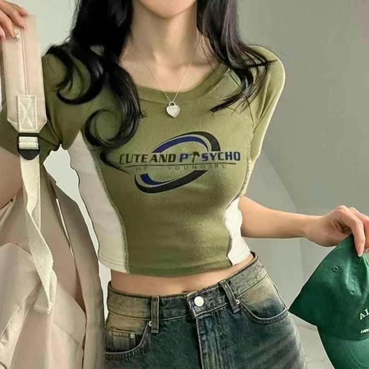 美式复古拼色印花T恤女螺纹冰丝时尚百搭修身短款圆领...