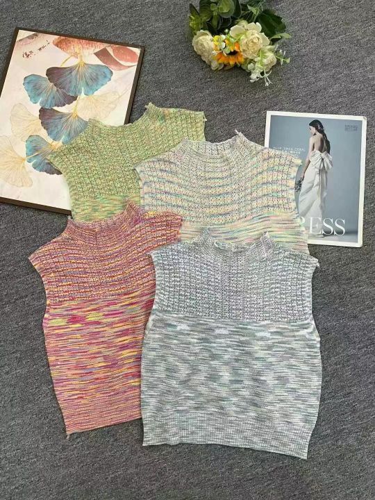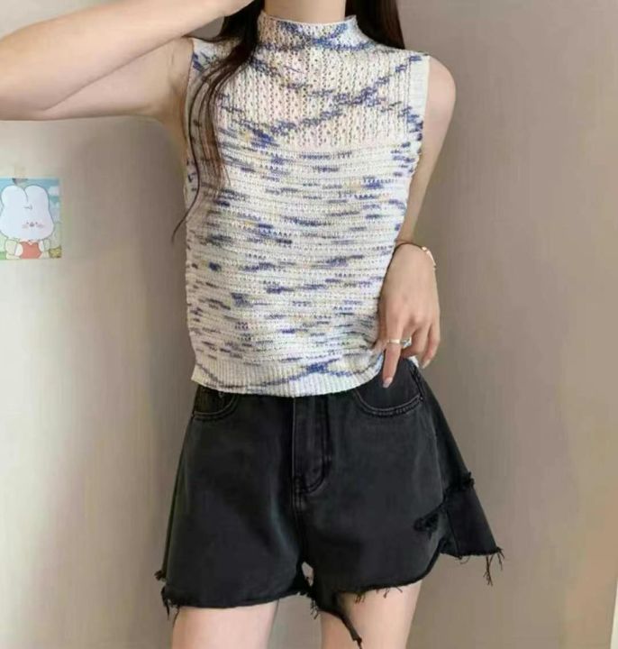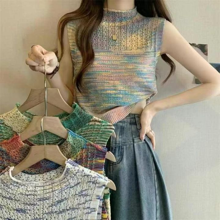 夏季新款彩虹条纹半高领冰丝针织无袖背心t恤,独立包...