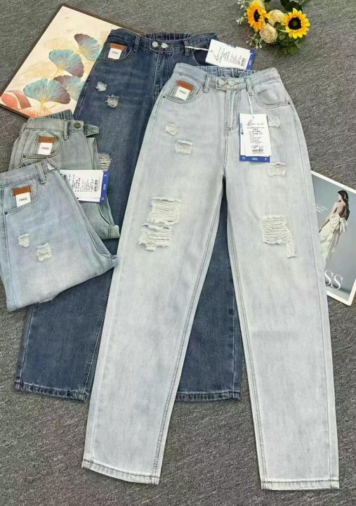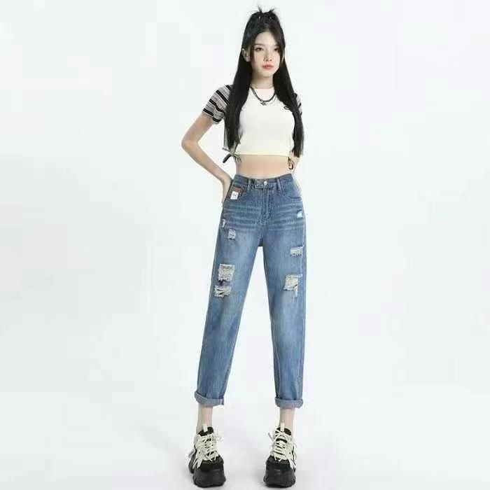 春夏新款女装洗水棉破洞牛仔老爹哈伦裤,独立包装带吊...