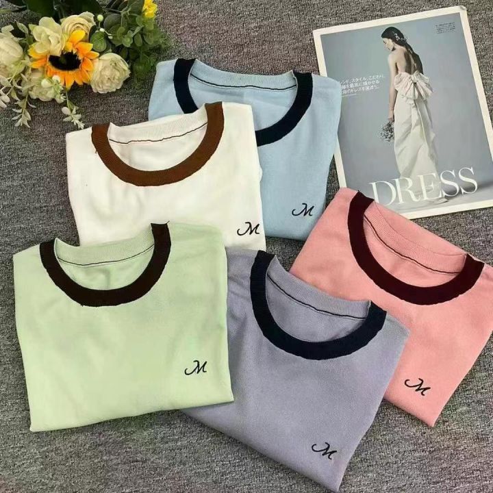 夏季新款宽松百搭设计感小众撞色圆领刺绣字母冰丝针织...