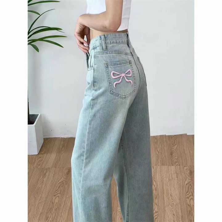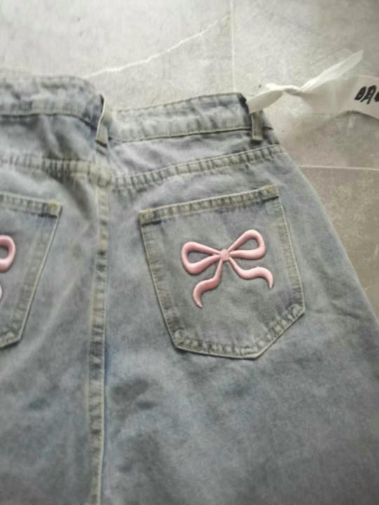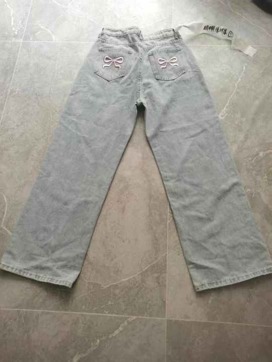 韩版ins复古牛仔裤女春夏新款高腰宽松显瘦蝴蝶结刺绣...