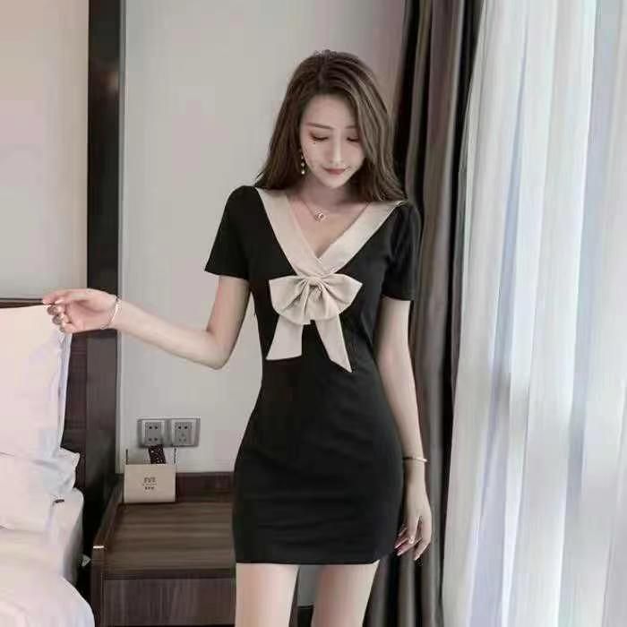 夏季新款名媛风V领蝴蝶结弹力修身2面可穿针织连衣裙,独立包装,均码面料柔软舒适弹力大,152件,全清7.9元超低价秒杀!