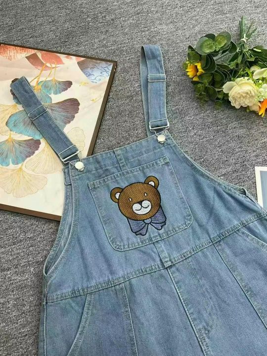 夏季新款洗水棉韩版宽松减龄可爱小熊刺绣牛仔背带短裤...