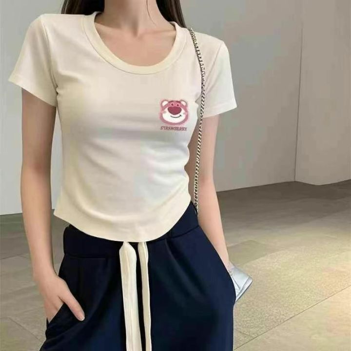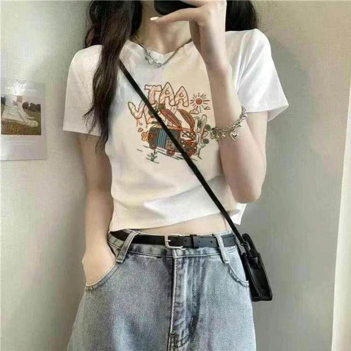 美式正肩修身显瘦冰丝印花短款辣妹T恤,多图案,高弹...