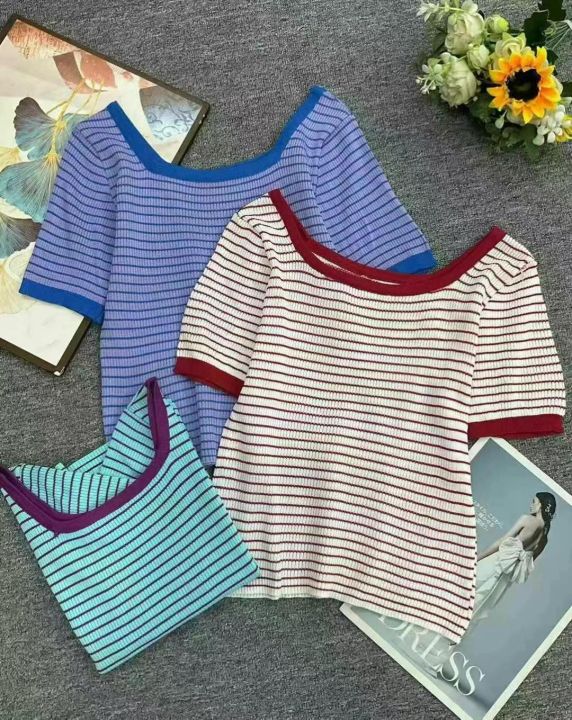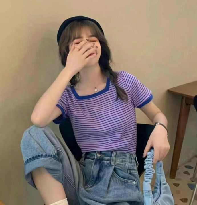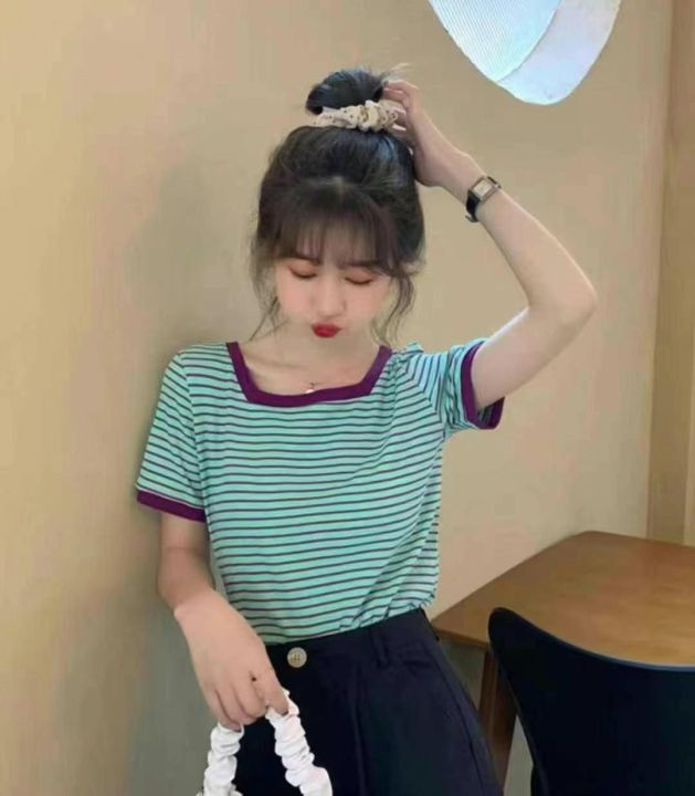 夏季新款韩版修身撞色方领条纹针织短袖T恤,独立包装...