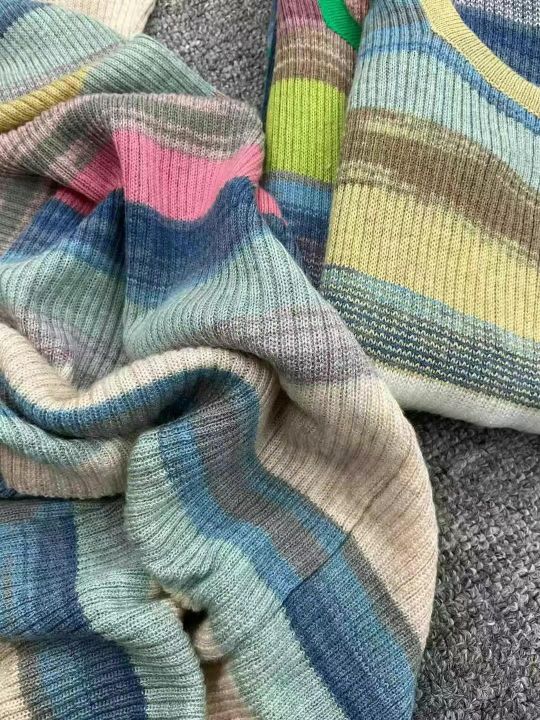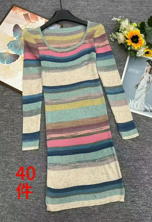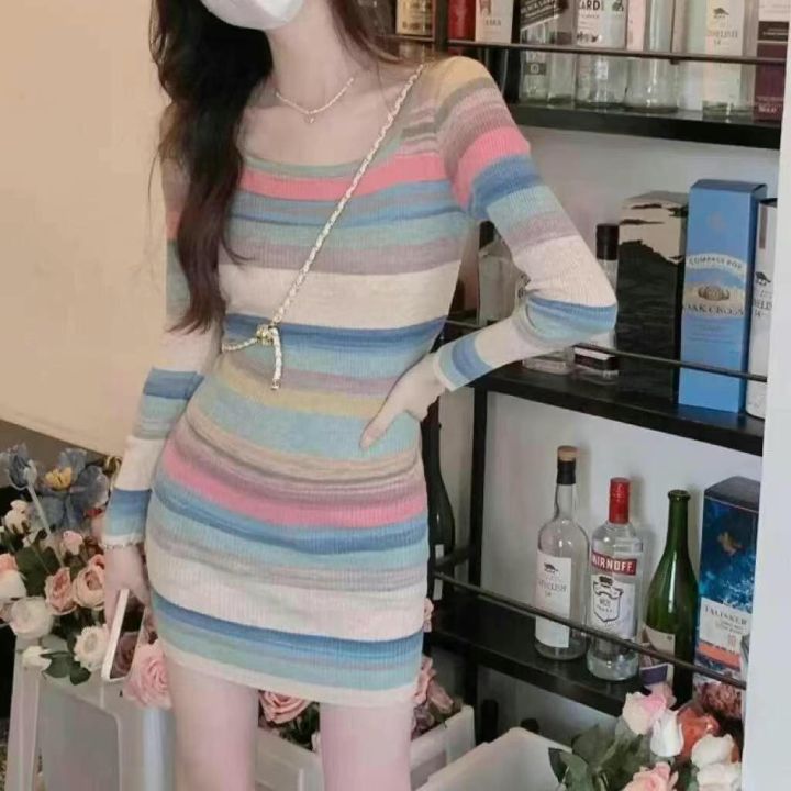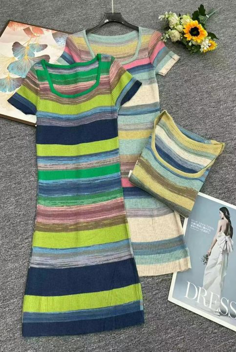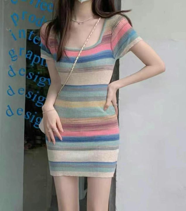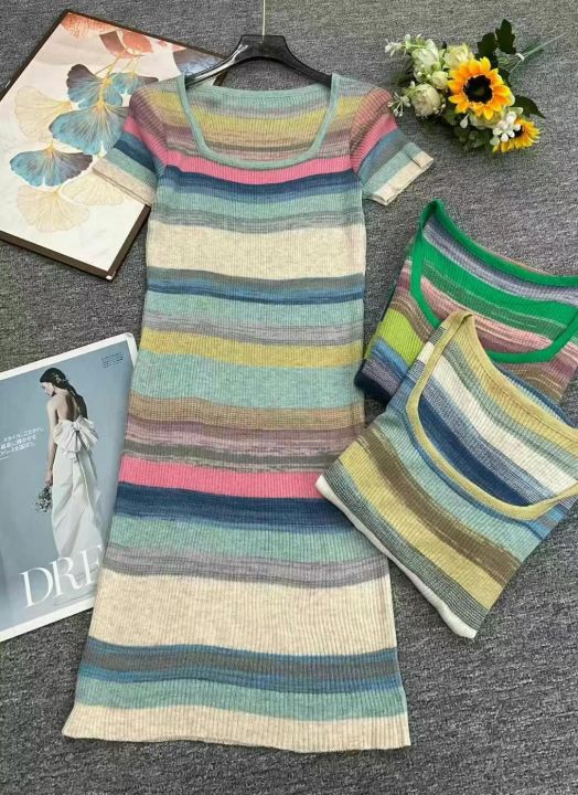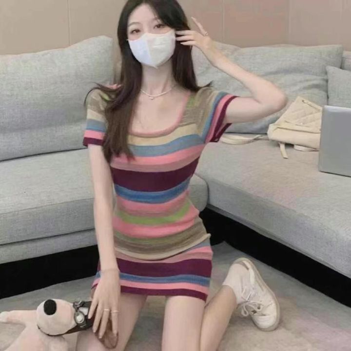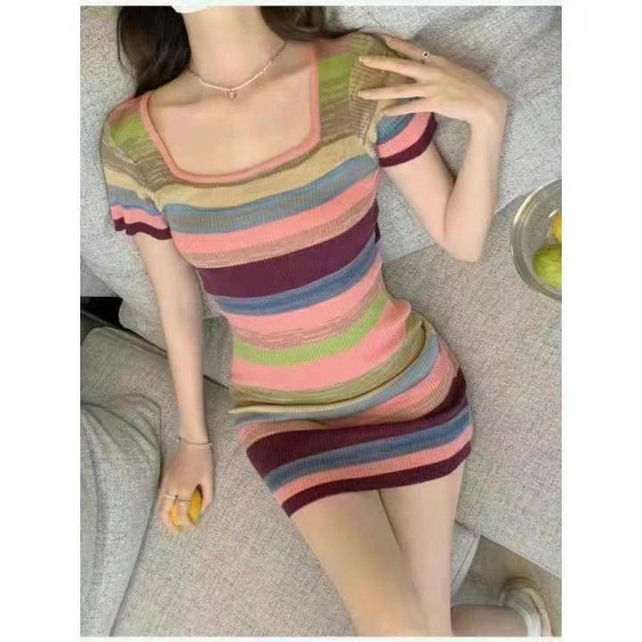 春夏新款薄款纯欲甜辣风彩色条纹针织连衣裙,独立包装...