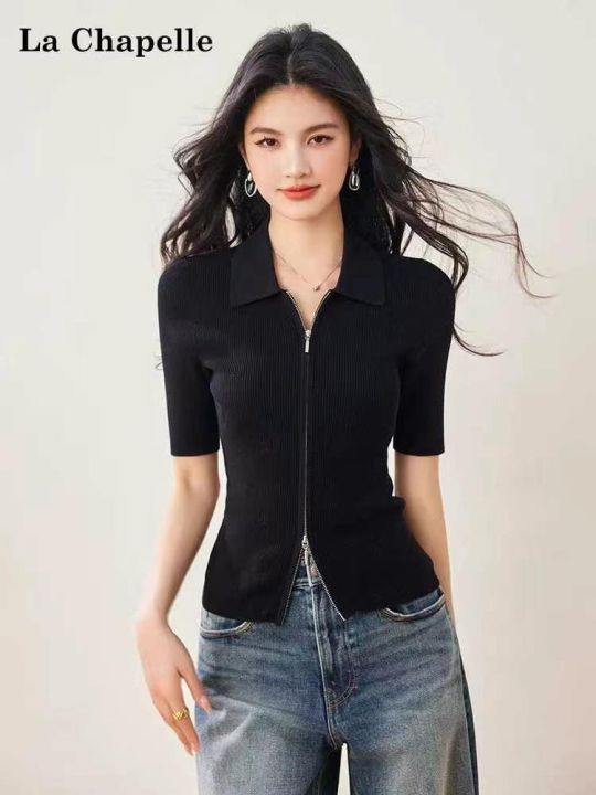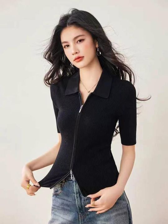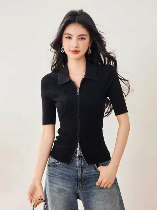 捡漏款,夏季新款Polo领双头拉链弹力修身显瘦针织短袖...