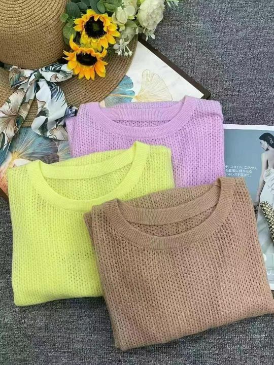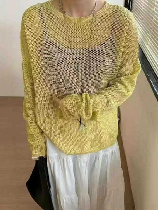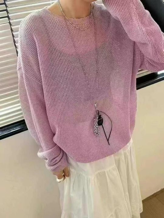 春夏新款多巴胺甜美清新宽松薄款长袖镂空针织小衫,独...