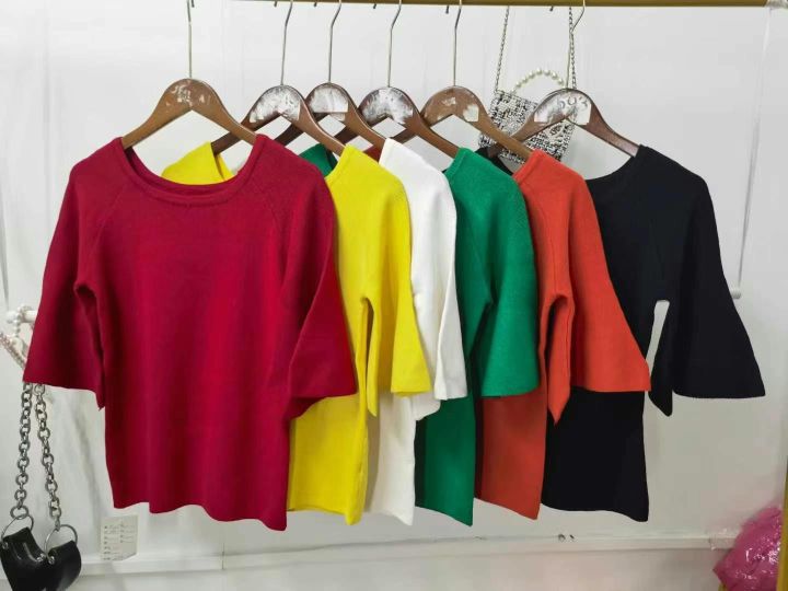 冰丝打底衫 女2025新款修身薄款荷叶边七分短袖 喇叭袖针织上衣。数量215条,独立包装,单款多色,高弹力面料,均码,全清6.5