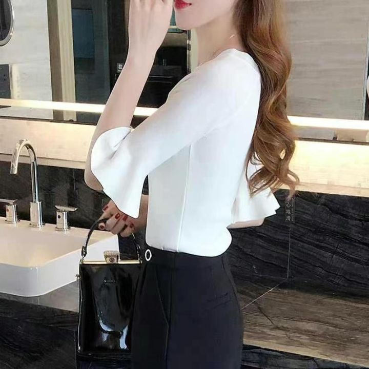 冰丝打底衫 女2025新款修身薄款荷叶边七分短袖 喇叭袖...