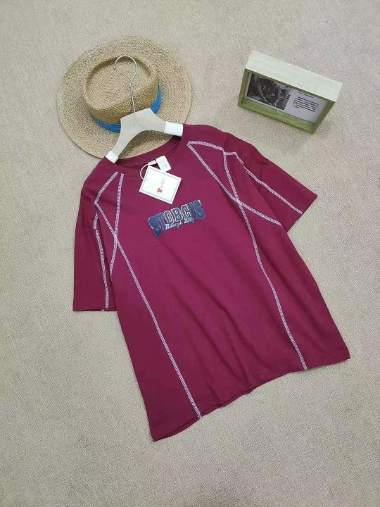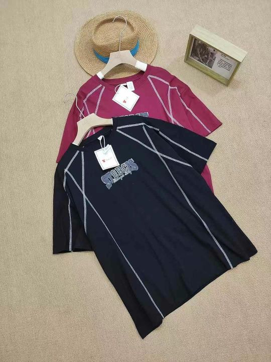 [月亮]:美式潮牌线条拼色设计宽松T恤