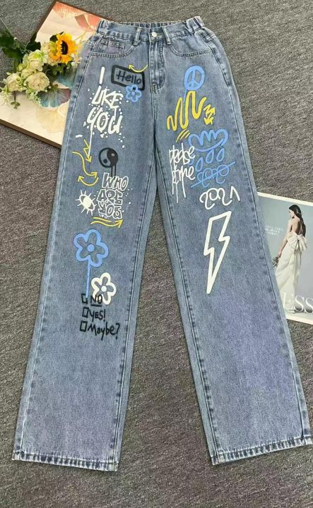 春季新款美式复古涂鸦印花趣味宽松直筒阔腿牛仔裤,独...
