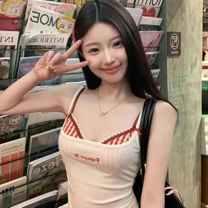 上新全清:4.9一件辣妹纯欲风格子蕾丝吊带假两件背心...