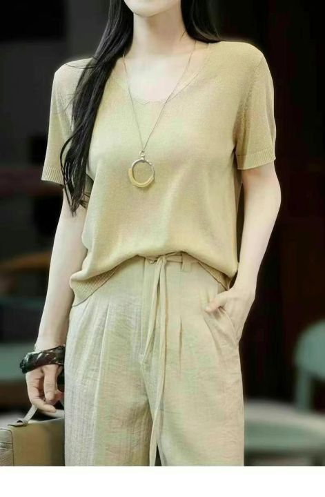 夏季新款宽松简约净版冰丝曲珠针织衫,独立包装,均码...