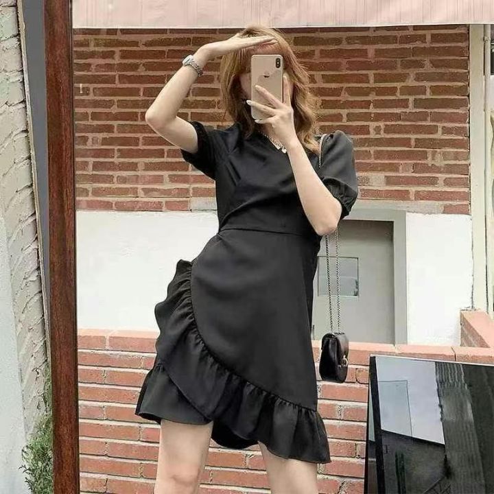 赫本风纯欲辣妹荷叶边泡泡袖收腰显瘦a字小黑裙.单款...