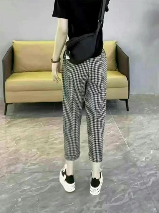 宽松版棉麻休闲裤,黑白格子九分哈伦裤
