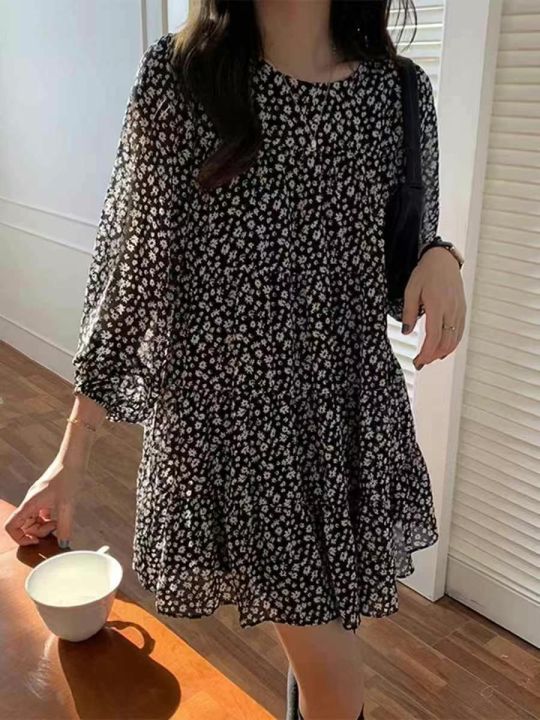 春秋新款甜美风小个子长袖碎花连衣裙短裙,大版宽松遮肚子